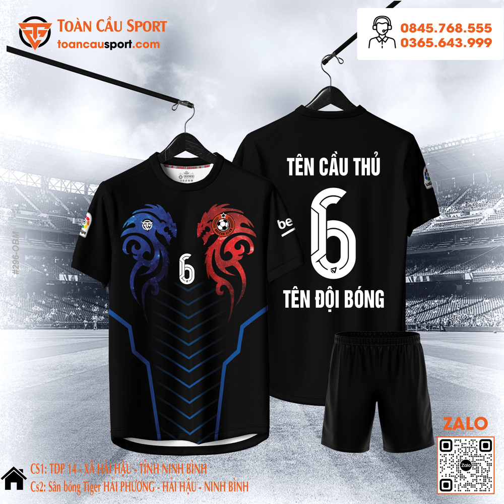 Màu đen mang đến cảm giác sang trọng, chuyên nghiệp và luôn là lựa chọn an toàn cho sân cỏ vì khả năng che vết bẩn tốt. Hơn thế nữa, họa tiết rồng đỏ và xanh là điểm nhấn không thể bỏ qua: đỏ thể hiện sự nhiệt huyết và năng lượng bứt phá, xanh giúp cân bằng – biểu trưng cho sự bản lĩnh và tỉnh táo trong thi đấu.
